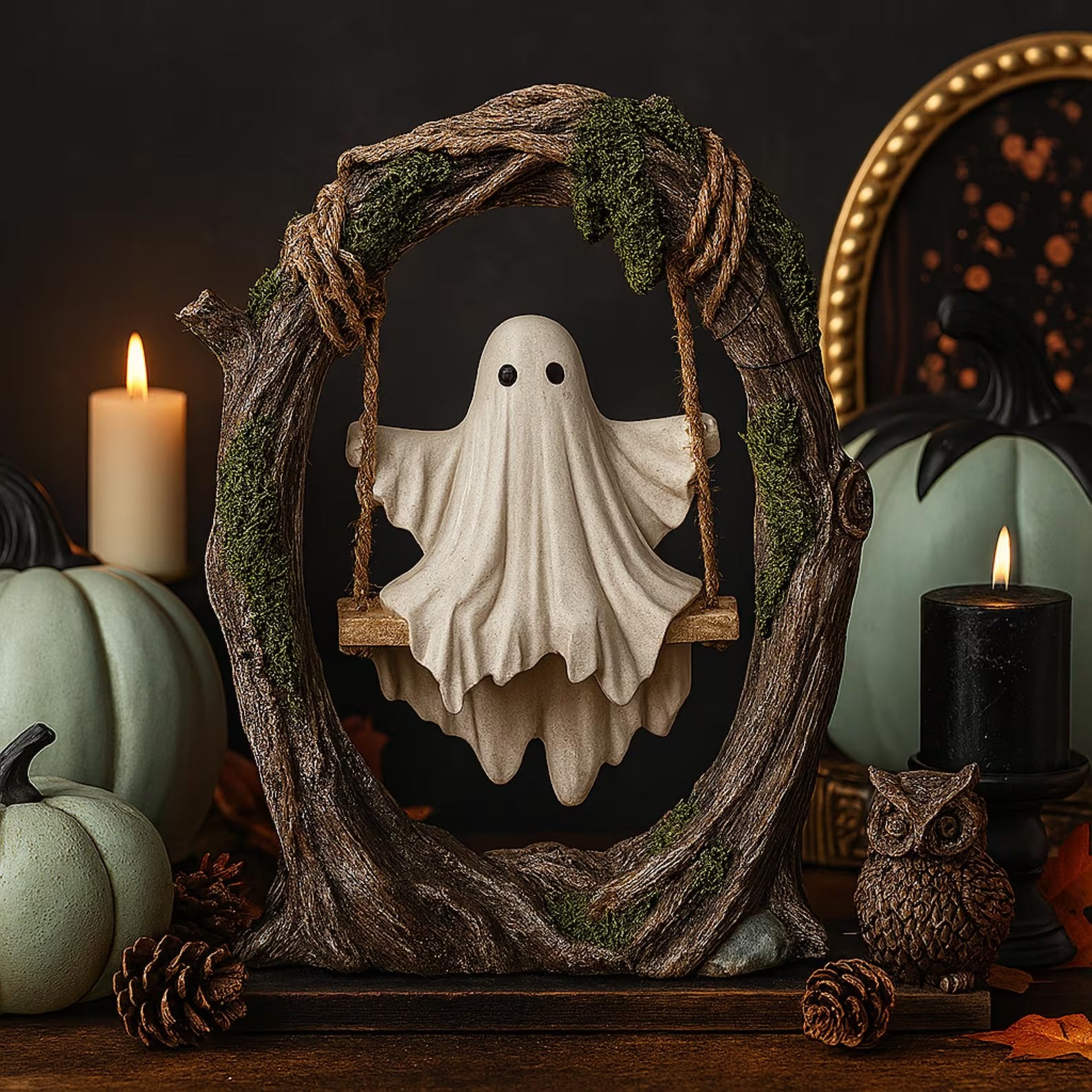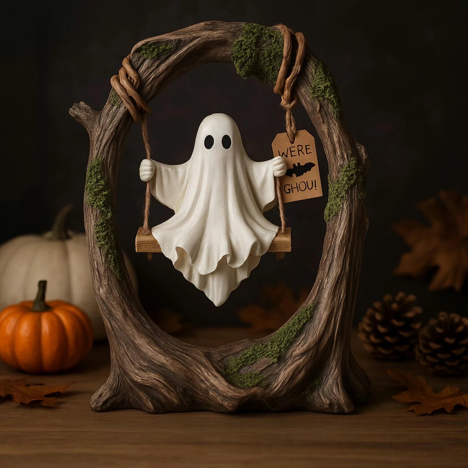 This charming ghost figurine gently sways on a rustic tree swing, capturing a playful yet eerie moment. The perfect blend of spooky and cute for Halloween displays – a ghost not to die for, but to cherish!