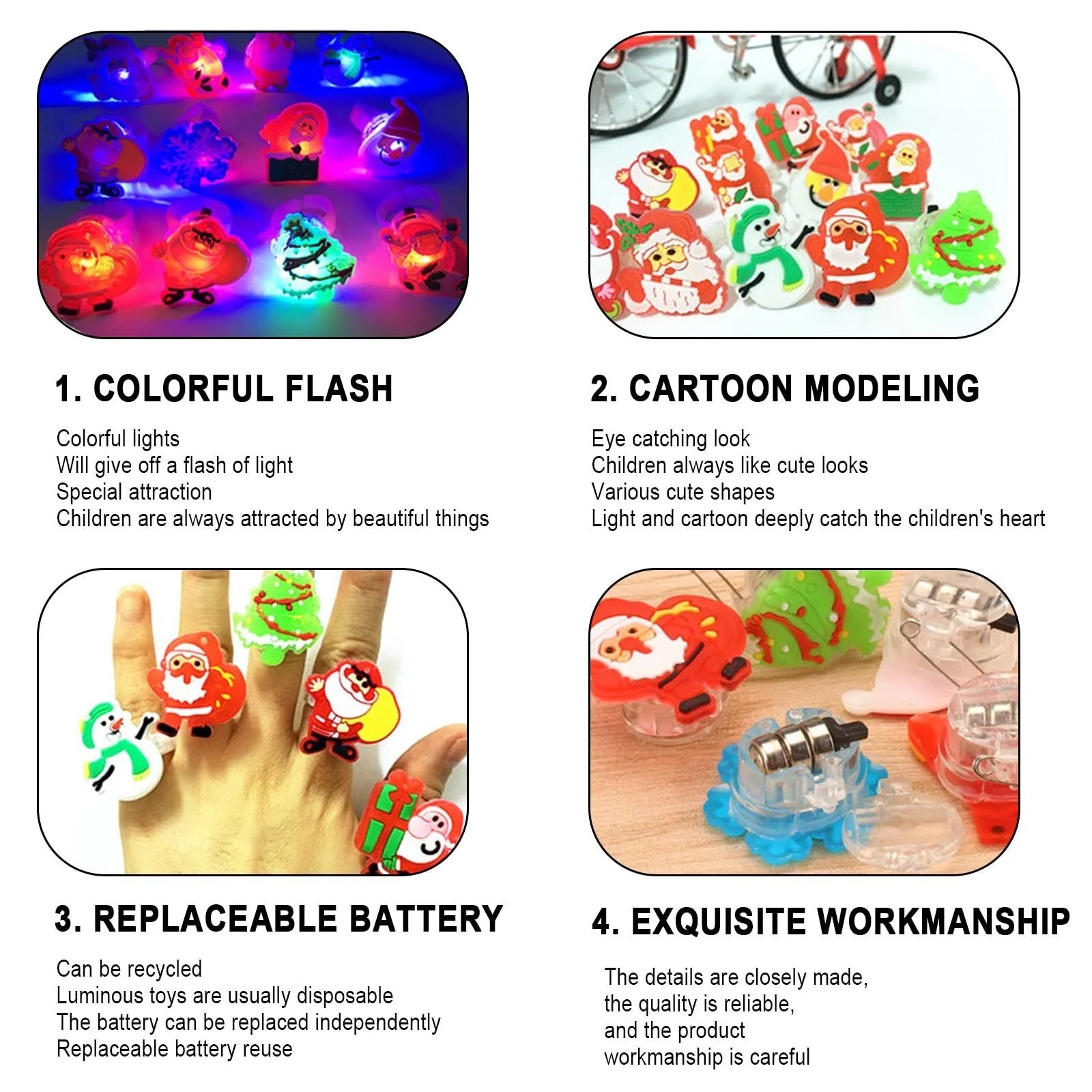 - Various Xmas Styles- The Assorted flashing LED lights in 10 different patterns of Christmas elements, such as Santa Claus, snowman,Christmas tree, snowflake,each style 5 pcs.Mini red&blue flashing rings are good candy bag fillers for gift exchange.